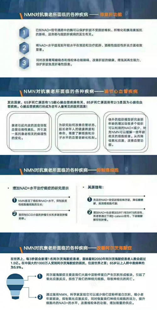 从图示可知,NMN的功效触及我们人体的各方面疾病,无论男女,无论年龄,只要不是小朋友,能存在因细胞衰老、组织衰老、器官衰老、整体衰老而引起的问题,但是有了NMN,能相当于有了一个全能的抗衰小助手,助你在抗衰路上平稳前行。